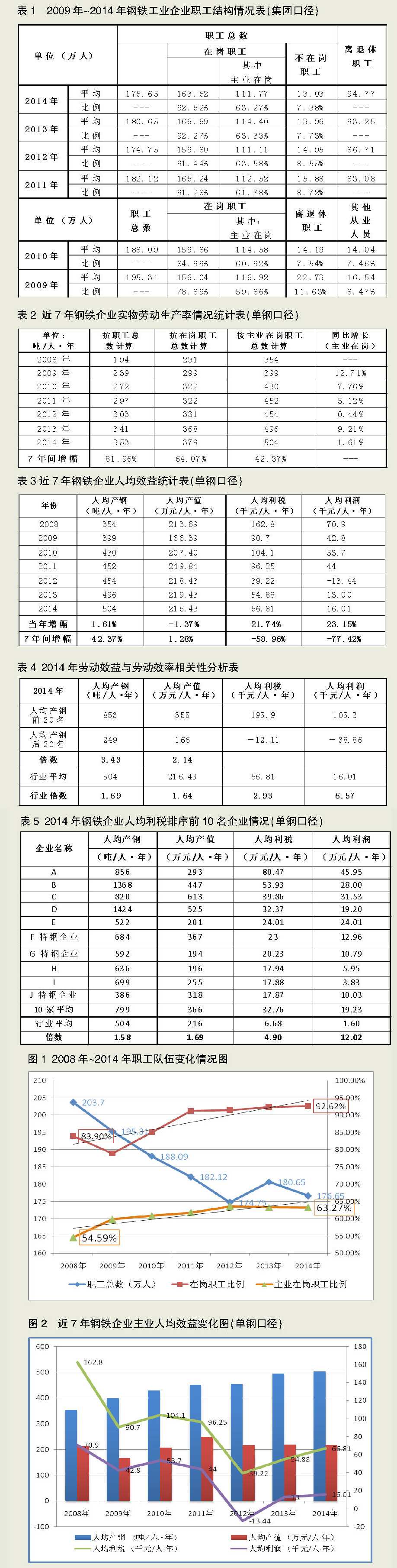 圖1顯示,2008年~2014年,納入統(tǒng)計范圍的鋼鐵企業(yè)粗鋼產(chǎn)量從3.9億噸提高到5.63億噸,增加了44%。與此同時,這些企業(yè)的職工總數(shù)從204萬人降低到177萬人,降低了13%。在崗職工比例逐年提高,7年提高了8.72個百分點,而不在崗職工比例逐年下降,主業(yè)在崗職工比例穩(wěn)步提高,7年提高了8.68個百分點。在行業(yè)形勢日趨嚴峻的情況下,企業(yè)通過自然減員、主動優(yōu)化等方式,“二線職工”“三線職工”等冗余人員的比例穩(wěn)步下降。